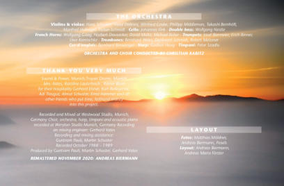 Die Produktion von 1986 ist vergriffen. 2020 erlebte COSMOGENIA eine Neuauflage. Zum einen wurde das Werk noch einmal remastert - es klingt besser denn je. Zum anderen gibt es nicht wie üblich die CD im Booklet, sondern in einem 40-seitigen, aufwendig gestalteten, kleinen Buch. Darin findet Ihr nicht nur alle Texte samt deutschen Übersetzungen, sondern auch viele fantastische Bilder zum Thema des Opus.