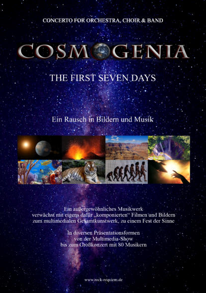 Das ROCK REQUIEM–Nachfolgewerk lehnt sich musikalisch nahtlos an seinen Vorgänger an: Rock-Klassik in Reinkultur – elegische Balladen, furiose Soloeinlagen, ein kraftvolles musikalisches Epos, das seinesgleichen sucht. Für die Produktion konnten Guntram Pauli, Christian Kabitz und Martin Schuster international renommierte Spitzenmusiker wie die Hammond-Ikone Brian Auger, Klaus Kreuzeder, Wolfgang Lackerschmidt, Peter Szadlo sowie Mitglieder der Münchner Philharmoniker gewinnen. COSMOGENIA erzählt die Geschichte der Schöpfung unserer Welt, angelehnt an die christliche Genesis. Sie wird ergänzt durch die Schöpfungsmythen anderer Religionen bzw. Kulturkreise. Es ist die Geschichte der „First seven days“ mit einer kritischen Nachbetrachtung. Die Zerstörung unsere Mutter Erde durch uns, ihre Kinder, ist Thema einer wehmütigen aber letztlich doch nicht zu pessimistischen Reflexion. COSMOGENIA ist ein thematisch ambitioniertes und engagiertes Konzeptwerk, wobei die „message“ allerdings nie im Vordergrund steht oder gar aufdringlich wird – das Stück soll allenfalls aufsehr behutsame Art zum Nachdenken anregen. Die Thematik ist und bleibt aktuell, und sie wird es wohl auch in Zukunft in vielleicht beängstigendem Ausmaß zunehmend sein. Die drei Komponisten haben ein außergewöhnliches Musikwerk geschaffen. Symphonieorchester, großer Chor, drei Gesangssolisten und eine zwölfköpfige Rockformation nutzen die ganze Bandbreite ihrer instrumentalen Möglichkeiten zur Verschmelzung scheinbar verschiedener musikalischer Welten – Klassik und Rock – zu einer einzigartigen Symbiose, Crossover im besten Sinne des Wortes.